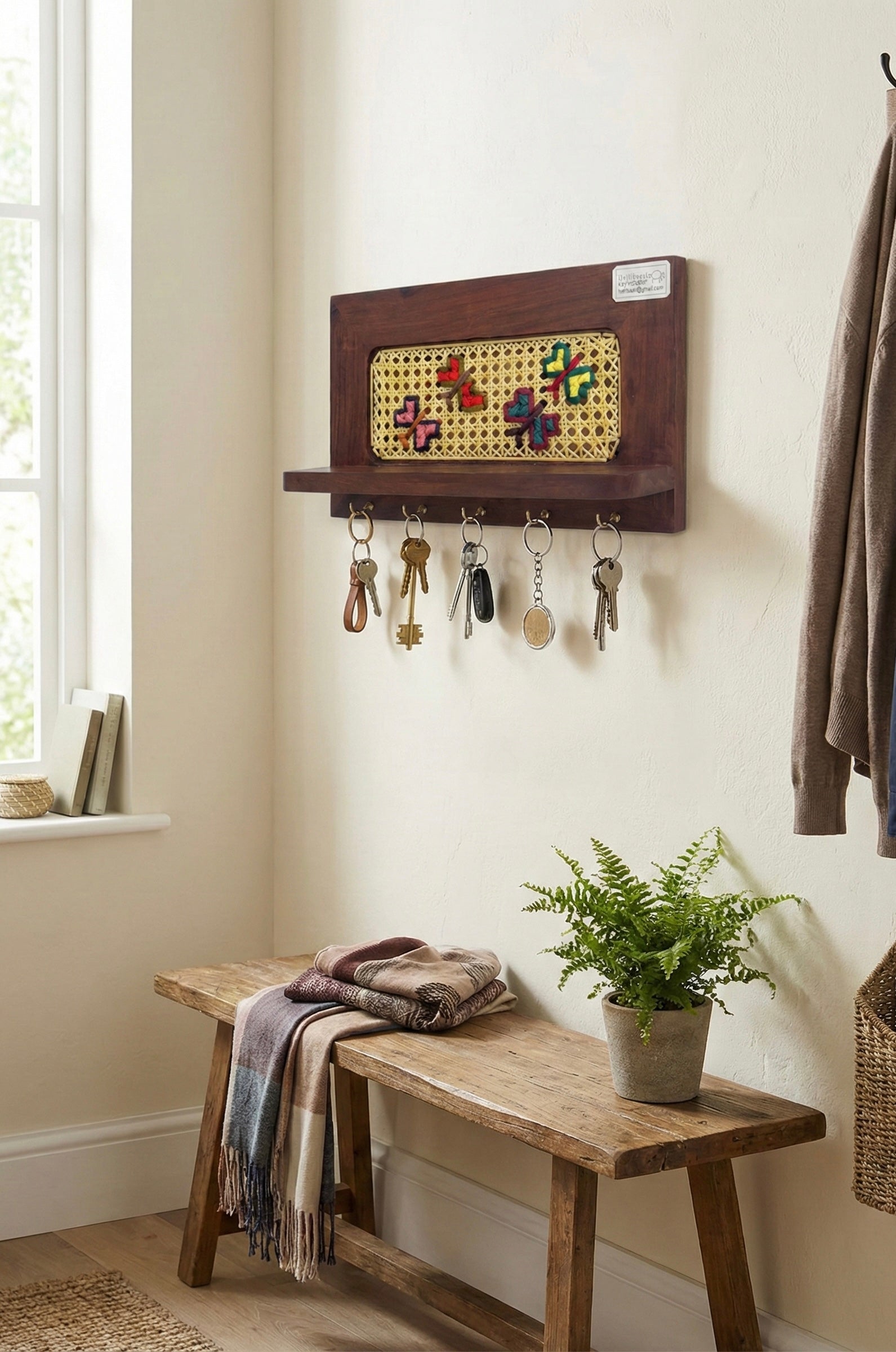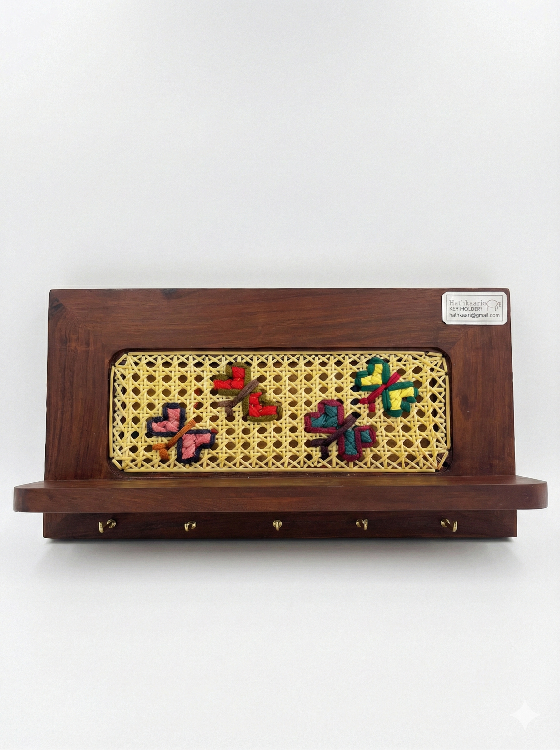 Organize your entryway with this handcrafted keekar (gum arabic tree) wood key holder. Features gold hooks, a top shelf, and embroidered butterflies on natural cane.